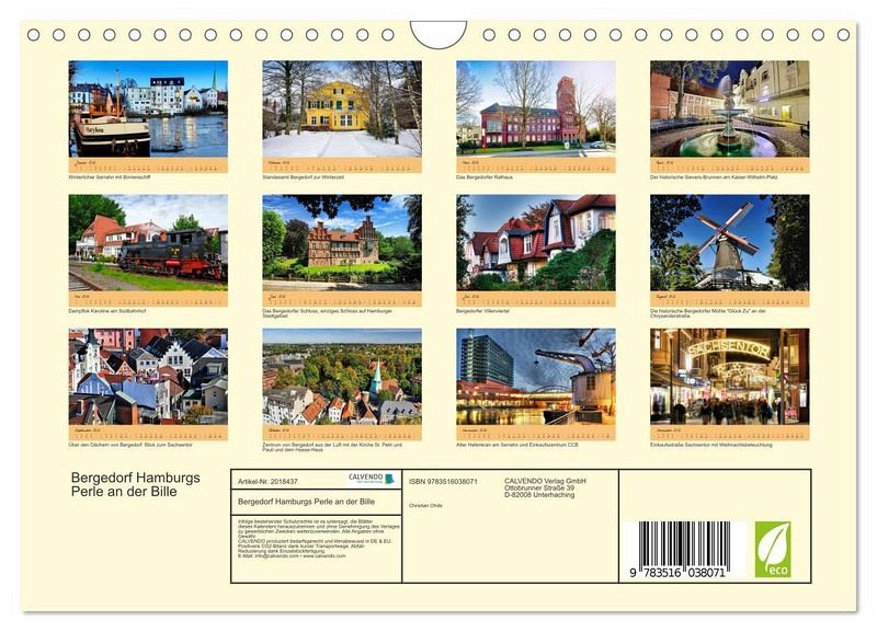 QUALITÄT - Hochwertiger Fotokalender mit 12 wunderschönen Motiven auf lichtbeständigem Bilderdruckpapier, robuste Spiralbindung mit Aufhängebügel.NACHHALTIG - deutliche Abfallreduzierung durch bedarfsgerechte Einzelstückfertigung, umweltfreundliches FSC-zertifiziertes Papier, Produktion in Deutschland, klimabewusste Logistik.PERFEKTES GESCHENK - Kalender für Freunde und Familie, für Kinder und Erwachsene, jung und alt, zu Weihnachten, Geburtstag oder zwischendurch.VIELFALT - Bildkalender in verschiedenen Formaten, z.B. DIN A5, DIN A4, DIN A3 sowie DIN A2. Ob Naturmotiv, Gemälde oder Fotos, ideal für ein persönliches Wohlfühlambiente.Einzigartige Fotos aus dem Hamburger Stadtteil Bergedorf als Begleiter durchs Jahr von Autor(in): Christian Ohde