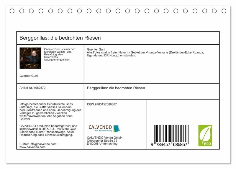 QUALITÄT - Hochwertiger Fotokalender mit 12 wunderschönen Motiven auf lichtbeständigem Bilderdruckpapier, robuste Spiralbindung.NACHHALTIG - deutliche Abfallreduzierung durch bedarfsgerechte Einzelstückfertigung, umweltfreundliches FSC-zertifiziertes Papier, Produktion in Deutschland, klimabewusste Logistik.PERFEKTES GESCHENK - Kalender für Freunde und Familie, für Kinder und Erwachsene, jung und alt, zu Weihnachten, Geburtstag oder zwischendurch.VIELFALT - Bildkalender in verschiedenen Formaten, z.B. DIN A5, DIN A4, DIN A3 sowie DIN A2. Ob Naturmotiv, Gemälde oder Fotos, ideal für ein persönliches Wohlfühlambiente.In den Virunga-Vulkanen, im Grenzgebiet zwischen Ruanda, Uganda und dem Kongo, leben die letzten Berggorillas im dichten Bergnebelwald. Erhalten Sie hautnahe Eindrücke aus dem Alltag der riesigen Menschenaffen. von Autor(in): Guenter Guni