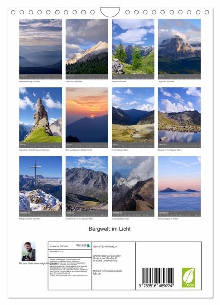 QUALITÄT - Hochwertiger Fotokalender mit 12 wunderschönen Motiven auf lichtbeständigem Bilderdruckpapier, robuste Spiralbindung mit Aufhängebügel.NACHHALTIG - deutliche Abfallreduzierung durch bedarfsgerechte Einzelstückfertigung, umweltfreundliches FSC-zertifiziertes Papier, Produktion in Deutschland, klimabewusste Logistik.PERFEKTES GESCHENK - Kalender für Freunde und Familie, für Kinder und Erwachsene, jung und alt, zu Weihnachten, Geburtstag oder zwischendurch.VIELFALT - Bildkalender in verschiedenen Formaten, z.B. DIN A5, DIN A4, DIN A3 sowie DIN A2. Ob Naturmotiv, Gemälde oder Fotos, ideal für ein persönliches Wohlfühlambiente.Lassen Sie sich entführen in die Bergwelt mit Ihren zahlreichen Lichtstimmungen von Autor(in): Michael Kehl