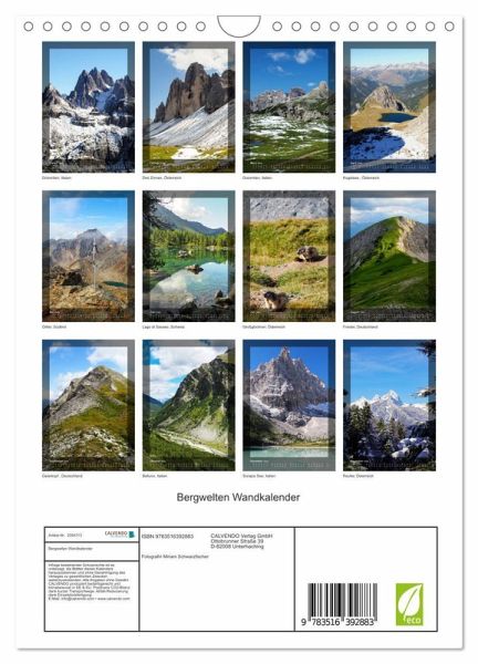 QUALITÄT - Hochwertiger Fotokalender mit 12 wunderschönen Motiven auf lichtbeständigem Bilderdruckpapier, robuste Spiralbindung mit Aufhängebügel.NACHHALTIG - deutliche Abfallreduzierung durch bedarfsgerechte Einzelstückfertigung, umweltfreundliches FSC-zertifiziertes Papier, Produktion in Deutschland, klimabewusste Logistik.PERFEKTES GESCHENK - Kalender für Freunde und Familie, für Kinder und Erwachsene, jung und alt, zu Weihnachten, Geburtstag oder zwischendurch.VIELFALT - Bildkalender in verschiedenen Formaten, z.B. DIN A5, DIN A4, DIN A3 sowie DIN A2. Ob Naturmotiv, Gemälde oder Fotos, ideal für ein persönliches Wohlfühlambiente.Alpen und deren Berge von Autor(in): Fotografin Schwarzfischer Miriam