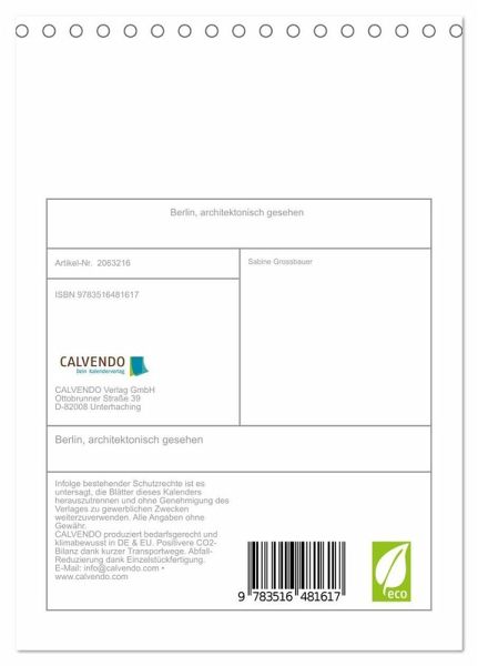 QUALITÄT - Hochwertiger Fotokalender mit 12 wunderschönen Motiven auf lichtbeständigem Bilderdruckpapier, robuste Spiralbindung.NACHHALTIG - deutliche Abfallreduzierung durch bedarfsgerechte Einzelstückfertigung, umweltfreundliches FSC-zertifiziertes Papier, Produktion in Deutschland, klimabewusste Logistik.PERFEKTES GESCHENK - Kalender für Freunde und Familie, für Kinder und Erwachsene, jung und alt, zu Weihnachten, Geburtstag oder zwischendurch.VIELFALT - Bildkalender in verschiedenen Formaten, z.B. DIN A5, DIN A4, DIN A3 sowie DIN A2. Ob Naturmotiv, Gemälde oder Fotos, ideal für ein persönliches Wohlfühlambiente.moderne Berliner Architektur, fotografisch interpretiert von Autor(in): Sabine Grossbauer
