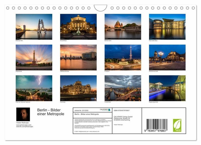 Berlin - eine der lebendigsten und aufregendsten Metropolen der Welt. 12 verschiedene Motive - farbenprächtig und aus den unterschiedlichsten Perspektiven. Entdecken Sie Berlin aus luftiger Höhe oder entlang des Ufers der Spree. Besuchen Sie jeden Monat einen neuen Ort und genießen Sie die Sehenswürdigkeiten der Stadt.