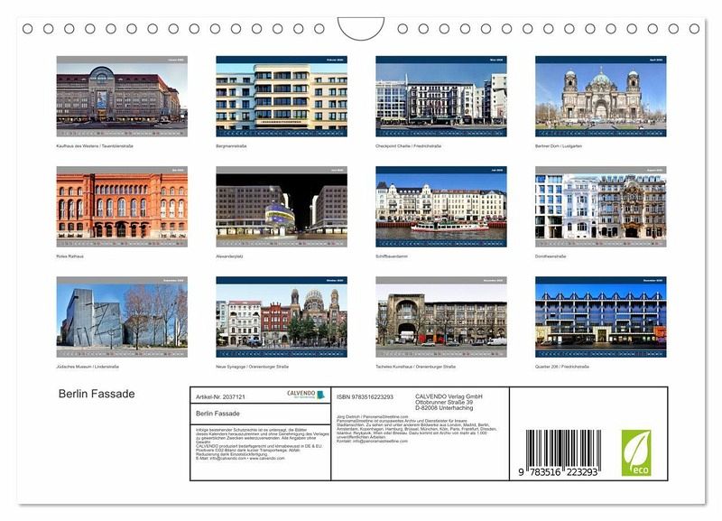 Berlin zeigt in diesem Architektur-Kalender die ganze Vielfalt seiner Fassaden. Das reicht von erhaltenen reich verzierten Gründerzeit Fassaden wie in der Dorotheenstraße über die Moderne, die DDR-Zeit bis zu spektakulären Neubauten wie dem Jüdischen Museum. Viele der Ansichten entstanden im PanoramaStreetline-Projekt als lineare Montagen aus verschiedenen Perspektiven und zeigen uns Berliner Baugeschichte wie man sie sonst nicht sehen kann.