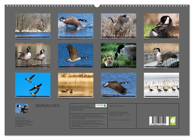 Les bernaches du Canada ont des liens familiaux très forts. Les couples restent unis toute leur vie. Dans ce calendrier, Philippe Henry nous montre des photos de cet oiseau, très familier des canadiens et très bruyant, au fil des quatre saisons.