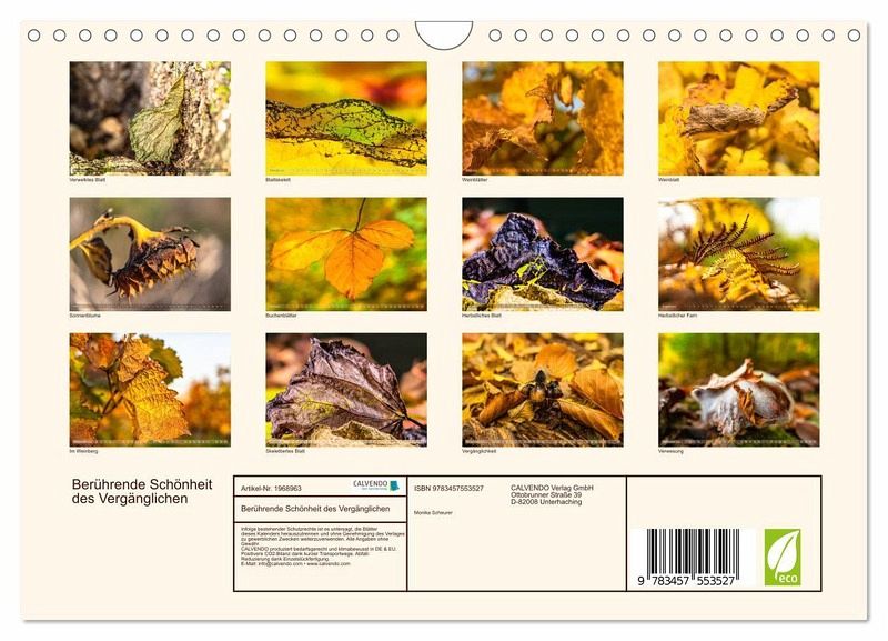 QUALITÄT - Hochwertiger Fotokalender mit 12 wunderschönen Motiven auf lichtbeständigem Bilderdruckpapier, robuste Spiralbindung mit Aufhängebügel.NACHHALTIG - deutliche Abfallreduzierung durch bedarfsgerechte Einzelstückfertigung, umweltfreundliches FSC-zertifiziertes Papier, Produktion in Deutschland, klimabewusste Logistik.PERFEKTES GESCHENK - Kalender für Freunde und Familie, für Kinder und Erwachsene, jung und alt, zu Weihnachten, Geburtstag oder zwischendurch.VIELFALT - Bildkalender in verschiedenen Formaten, z.B. DIN A5, DIN A4, DIN A3 sowie DIN A2. Ob Naturmotiv, Gemälde oder Fotos, ideal für ein persönliches Wohlfühlambiente.Der Herbst zeigt die Vergänglichkeit der Natur. von Autor(in): Monika Scheurer