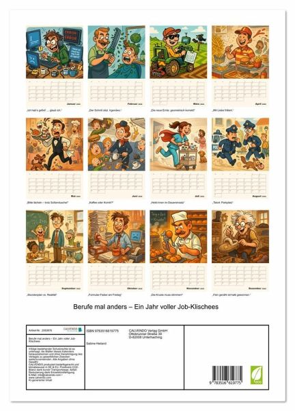 PREMIUM-LINIE - Brillanter Fotokalender mit 12 wunderschönen Motiven, Kunstdruck in Hochglanz in Museumsqualität.QUALITÄT - edle Materialien, stabile Rückwand mit 2 innovativen Einstecktaschen für eine optimale Präsentation an der Wand.NACHHALTIG - deutliche Abfallreduzierung durch bedarfsgerechte Einzelstückfertigung, umweltfreundliches FSC-zertifiziertes Papier, Produktion in Deutschland, klimabewusste Logistik.PERFEKTES GESCHENK - Kalender für Freunde und Familie, für Kinder und Erwachsene, jung und alt, zu Weihnachten, Geburtstag oder zwischendurch.Cartoon-Kalender mit Berufsklischees von Autor(in): Sabine Heiland
