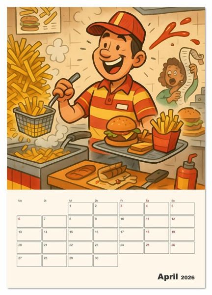Jedes Monatsbild steckt voller übertriebener Details, die zum Schmunzeln einladen - vom Friseur mit Heckenschere bis zum Polizisten im Donut-Einsatz.