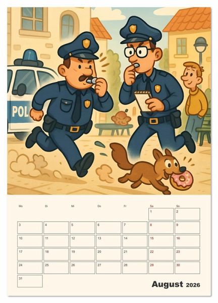 Jedes Monatsbild steckt voller übertriebener Details, die zum Schmunzeln einladen - vom Friseur mit Heckenschere bis zum Polizisten im Donut-Einsatz.