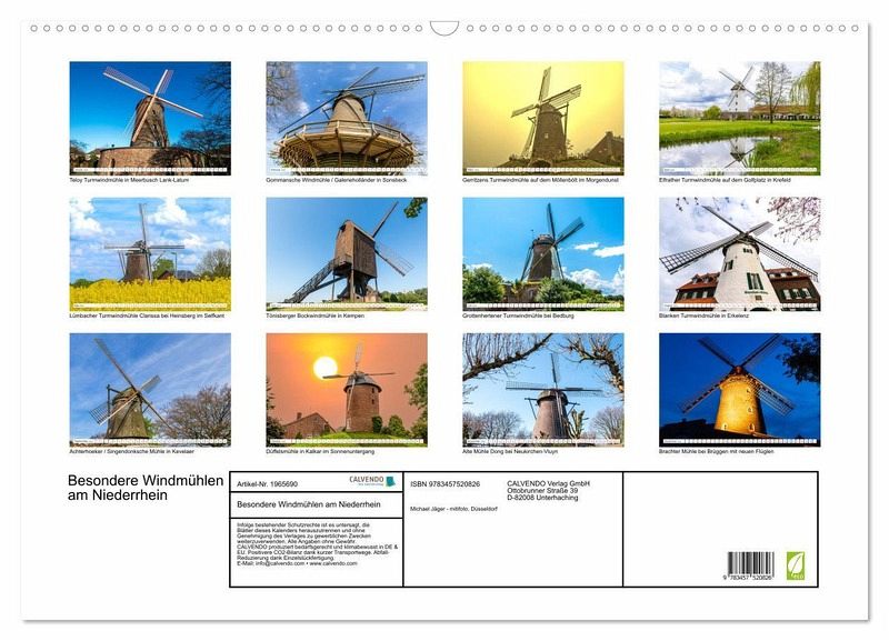 Windmühlen waren die ersten Maschinen, um Energie zu gewinnen. Viele historische Mühlen sind inzwischen stillgelegt oder abgerissen. Aber einige dieser Landmarken wurden als Technikdenkmäler erhalten. Mein Mühlenkalender richtet sich an Mühlenfreunde und jene, die sich für den Erhalt dieser Kulturgüter einsetzen. Das Deckblatt zeigt die Geismühle in Krefeld. Weitere Details zu den dargestellten Mühlen unter www.mitifoto.de.