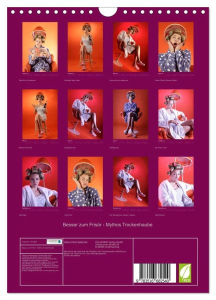 Erinnern Sie sich noch an die Zeit der Trockenhauben? Die Frisuren waren ästhetischer Horror und man hätte sich gewünscht, mehr Frauen würden den Frisör wechseln. Eine humorvolle Fotoserie zum Thema Fönhaube im Vintage-Style voller Lockenwickler. Schenken Sie diesen Kalender dem Frisör ihres Vertrauens!