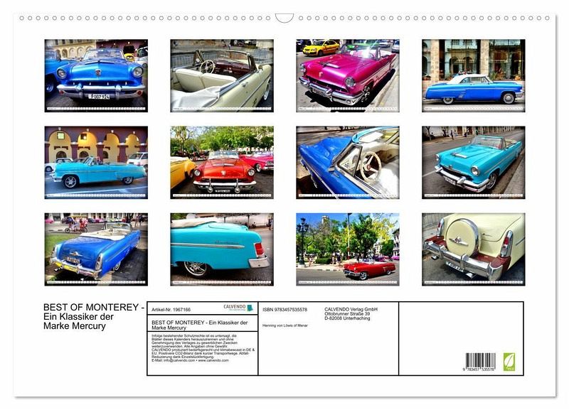 QUALITÄT - Hochwertiger Fotokalender mit 12 wunderschönen Motiven auf lichtbeständigem Bilderdruckpapier, robuste Spiralbindung mit Aufhängebügel.NACHHALTIG - deutliche Abfallreduzierung durch bedarfsgerechte Einzelstückfertigung, umweltfreundliches FSC-zertifiziertes Papier, Produktion in Deutschland, klimabewusste Logistik.PERFEKTES GESCHENK - Kalender für Freunde und Familie, für Kinder und Erwachsene, jung und alt, zu Weihnachten, Geburtstag oder zwischendurch.VIELFALT - Bildkalender in verschiedenen Formaten, z.B. DIN A5, DIN A4, DIN A3 sowie DIN A2. Ob Naturmotiv, Gemälde oder Fotos, ideal für ein persönliches Wohlfühlambiente.Der US-Oldtimer Mercury Monterey in Havanna von Autor(in): Henning von Loewis of Menar