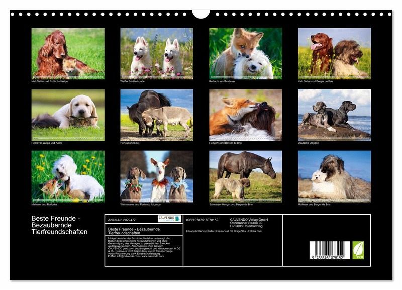 QUALITÄT - Hochwertiger Fotokalender mit 12 wunderschönen Motiven auf lichtbeständigem Bilderdruckpapier, robuste Spiralbindung mit Aufhängebügel.NACHHALTIG - deutliche Abfallreduzierung durch bedarfsgerechte Einzelstückfertigung, umweltfreundliches FSC-zertifiziertes Papier, Produktion in Deutschland, klimabewusste Logistik.PERFEKTES GESCHENK - Kalender für Freunde und Familie, für Kinder und Erwachsene, jung und alt, zu Weihnachten, Geburtstag oder zwischendurch.VIELFALT - Bildkalender in verschiedenen Formaten, z.B. DIN A5, DIN A4, DIN A3 sowie DIN A2. Ob Naturmotiv, Gemälde oder Fotos, ideal für ein persönliches Wohlfühlambiente.Besondere Tierfreundschaften in wunderschönen Bildern von Autor(in): Elisabeth Stanzer
