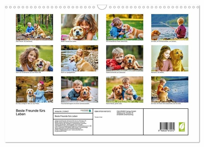 Jeden Monat ein neues Kapitel echter Freundschaft - mit Bildern, die das Herz berühren und Erinnerungen wecken. Für alle, die wissen: Beste Freunde sind das schönste Geschenk des Lebens. Kind & Hund - liebevoll & verspielt Ein Jahr voller Pfotenspuren und Kinderlachen - dieser Kalender feiert die kleinen Momente großer Freundschaft. Für alle, die wissen: Ein Blick, ein Bellen, ein Lächeln - das ist Liebe auf Lebenszeit. Ob als liebevolles Geschenk oder täglicher Begleiter - dieser Kalender erinnert Monat für Monat daran, wie schön es ist, jemanden an seiner Seite zu haben. Für Kinder,…mehr