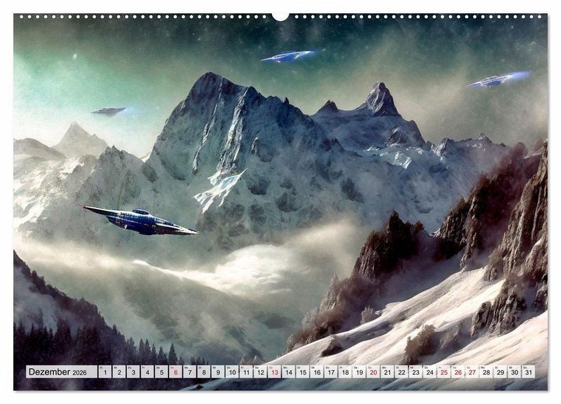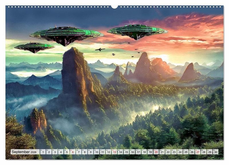 Die Frage, ob es außer uns Erdenbewohner noch andere Lebewesen, vor allem intelligente Lebewesen irgendwo im Universum gibt, beschäftigt die Menschen seit Generationen. Unser Bildkalender scheint eine Antwort darauf zu geben, aber es sind keine Tatsachen, die hier abgebildet sind, sondern Fiktionen - allerdings auf eine sehr wirkungsvolle und realitätsnahe Weise. Die Bilder zeigen fremde Raumschiffe, die sich friedlich in verschiedenen Landschaften dieser Erde bewegen. Die Annahme, dass auch eine friedliche Begegnung möglich ist, sollte uns Zuversicht geben und die nötige Gelassenheit, um die Monatsbilder gebührend bewundern zu können. Für die Schaffung dieser Bilder hat sich eine künstliche Intelligenz ins Zeug gelegt.