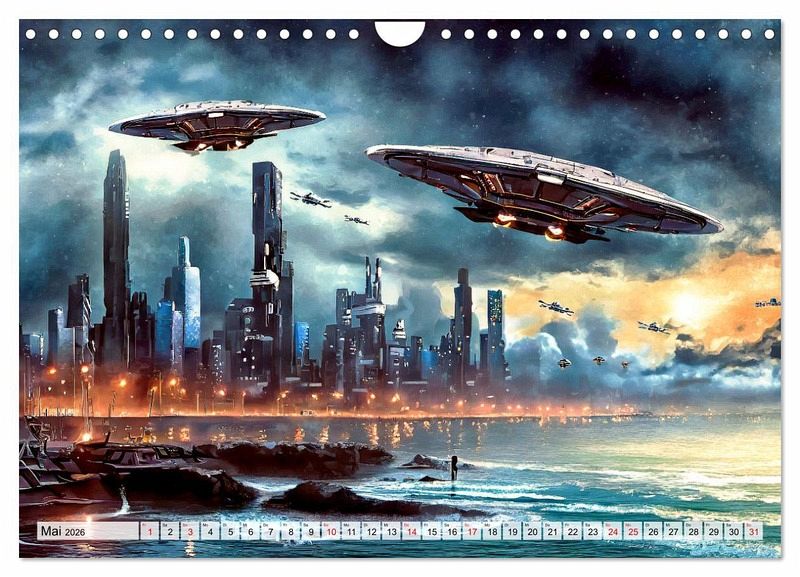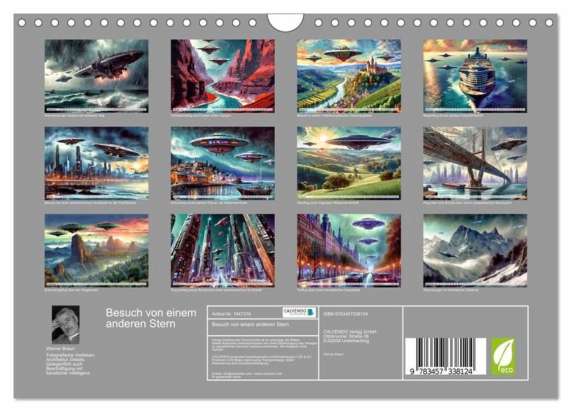 Die Frage, ob es außer uns Erdenbewohner noch andere Lebewesen, vor allem intelligente Lebewesen irgendwo im Universum gibt, beschäftigt die Menschen seit Generationen. Unser Bildkalender scheint eine Antwort darauf zu geben, aber es sind keine Tatsachen, die hier abgebildet sind, sondern Fiktionen - allerdings auf eine sehr wirkungsvolle und realitätsnahe Weise. Die Bilder zeigen fremde Raumschiffe, die sich friedlich in verschiedenen Landschaften dieser Erde bewegen. Die Annahme, dass auch eine friedliche Begegnung möglich ist, sollte uns Zuversicht geben und die nötige Gelassenheit, um die Monatsbilder gebührend bewundern zu können. Für die Schaffung dieser Bilder hat sich eine künstliche Intelligenz ins Zeug gelegt.