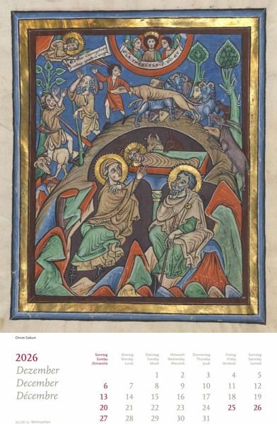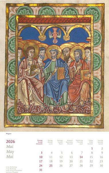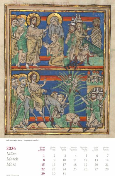Zu den kostbarsten Kunstwerken des Mittelalters zählen Handschriften mit Buchmalereien. Prachtvollen Miniaturen und ausgefeilte Initialen schmückten Stundenbücher und auch Werke für den liturgischen Einsatz. Eines der schönsten erhaltenen Exemplare ist das Speyerer Evangelistar. Es handelt sich um eine mit Gold und kostbaren Pigmenten ausgestattete Meisterarbeit der spätromanischen Buchkunst, die zur Feier der liturgischen Feste im Speyerer Dom diente. Der Beuroner Kunstkalender 2026 öffnet diesen Schatz und zeigt 13 ausgewählte Bilder aus diesem Kunstwerk. Hochwertig gedruckt und im großen Format leuchten die Bilder Monat für Monat neu in unsere Gegenwart.