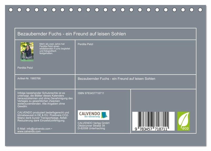 Die Naturfotografin Perdita Petzl hat einen Fuchs mehr als zwei Jahre lang begleitet. Dabei sind brilliante und intime Portraits von herausragender Qualität entstanden. Dieser liebevoll gestaltete Kalender ist ein absolutes Muss für Tierfreunde und Fuchsliebhaber!
