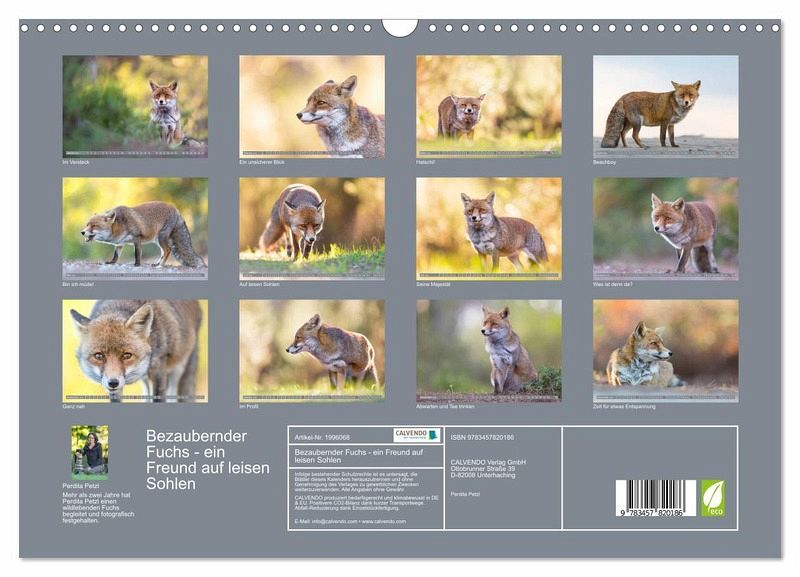 Die Naturfotografin Perdita Petzl hat einen Fuchs mehr als zwei Jahre lang begleitet. Dabei sind brilliante und intime Portraits von herausragender Qualität entstanden. Dieser liebevoll gestaltete Kalender ist ein absolutes Muss für Tierfreunde und Fuchsliebhaber!
