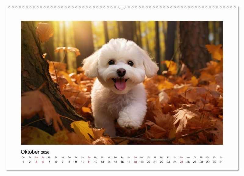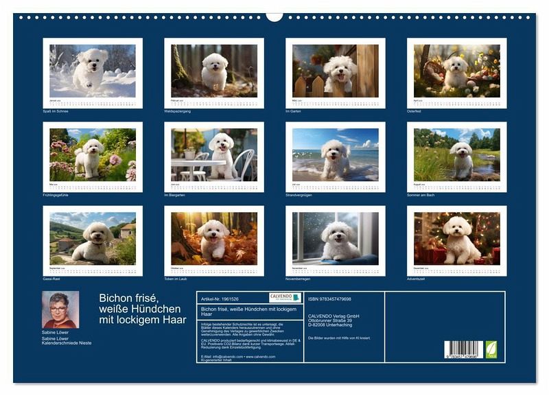Sind sie nicht niedlich, die weiß-gelockten Bichon Frisés? Diese "Schoßhündchen" haben vor allem eine Aufgabe: Sie sind Hunde zum Liebhaben und Knuddeln. Sie erfreuen allein durch ihre Anwesenheit, ohne einen weiteren Zweck erfüllen zu müssen. Die Autorin hat mit Hilfe von KI bezaubernde, fotoähnliche Bilder erstellt, die Sie Monat für Monat erfreuen werden.