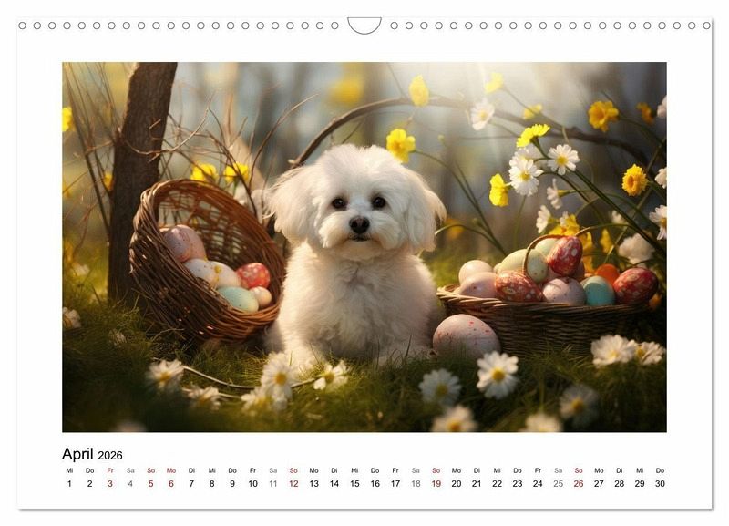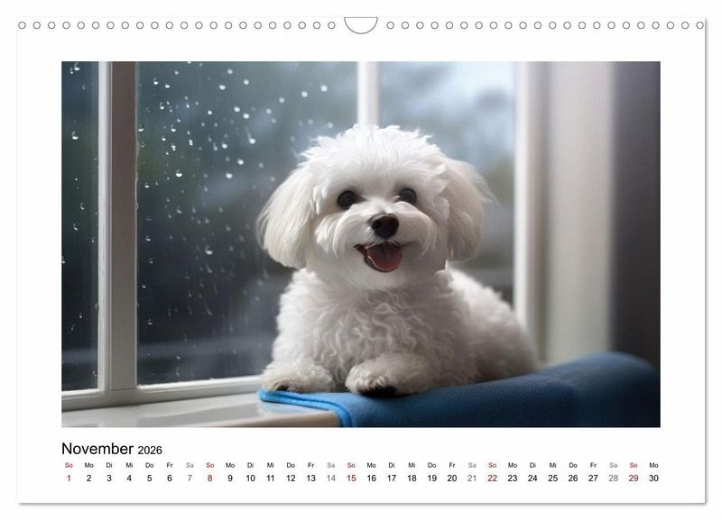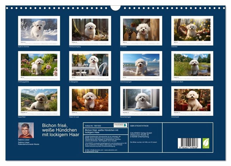 Sind sie nicht niedlich, die weiß-gelockten Bichon Frisés? Diese "Schoßhündchen" haben vor allem eine Aufgabe: Sie sind Hunde zum Liebhaben und Knuddeln. Sie erfreuen allein durch ihre Anwesenheit, ohne einen weiteren Zweck erfüllen zu müssen. Die Autorin hat mit Hilfe von KI bezaubernde, fotoähnliche Bilder erstellt, die Sie Monat für Monat erfreuen werden.