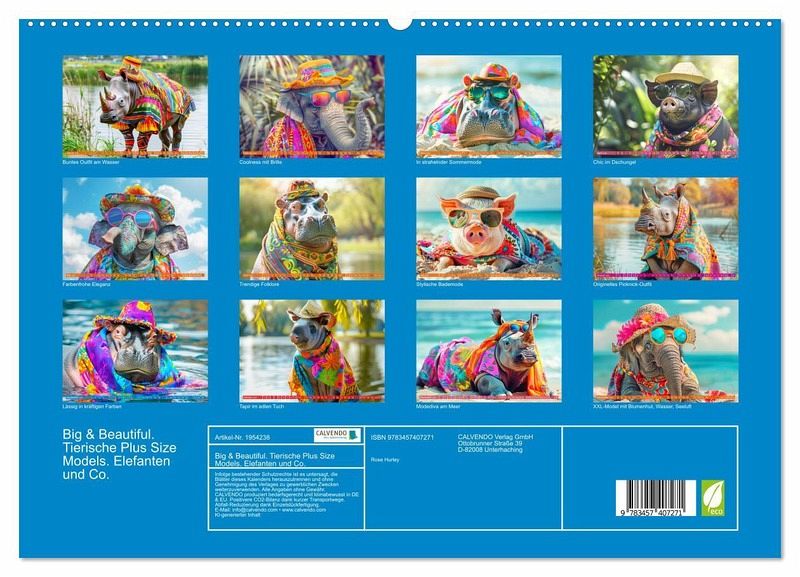 Tauchen Sie ein in die wundersame Welt der tierischen Mode! Dieser Kalender präsentiert die mit Hilfe von KI erstellten, schönsten Plus Size-Models der Tierwelt, vom majestätischen Elefanten bis zum gemütlichen Schwein, alle in maßgeschneiderten Designerhüten und Schals. Diese charmanten Wesen zeigen stolz ihre Kurven während sie am Strand, am Seeufer und auf der grünen Wiese posieren. Lassen Sie sich von ihrer Selbstsicherheit und ihrem Stil inspirieren!
