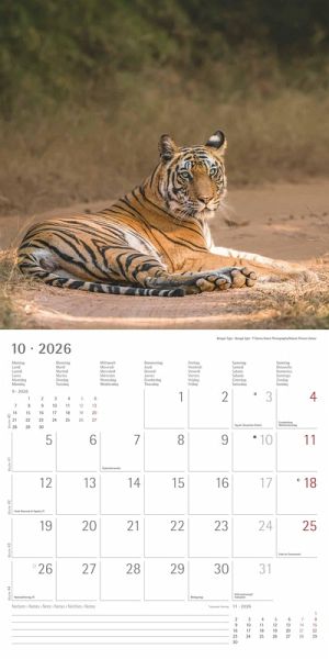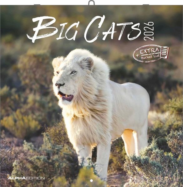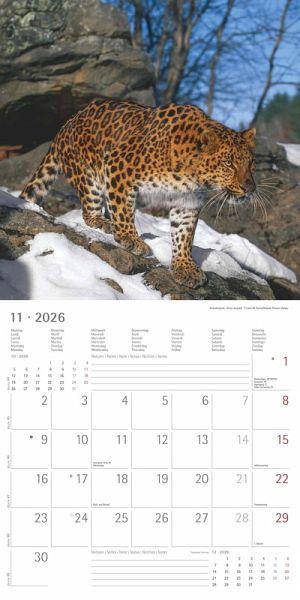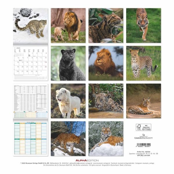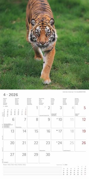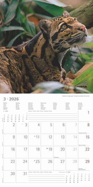 Das übersichtliche Kalendarium, welches Monat für Monat zahlreiche Zusatzinformationen liefert (z. B. Monatsübersichten, Ferientermine oder Mondphasen) und auch viel Platz für Notizen bietet, fügt sich harmonisch unter den Fotomotiven an. Der Wandkalender Großkatzen 2026 der Marke Alpha Edition ist eine tolle Geschenkidee und begeistert jeden Wildtier-Fan.
