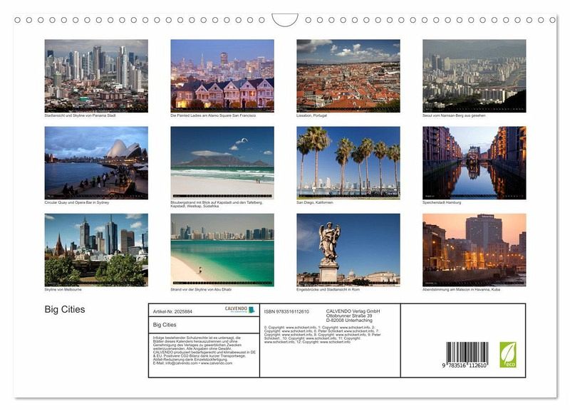 Eine Weltreies im Kalenderformat mit einigen der spannendsten Städte dieser Welt - von San Francisco über Hamburg bis Kapstadt und von Sydney bis Havanna sind alle Kontinente in diesem Kalender vom Reisefotografen Peter Schickert vertreten.