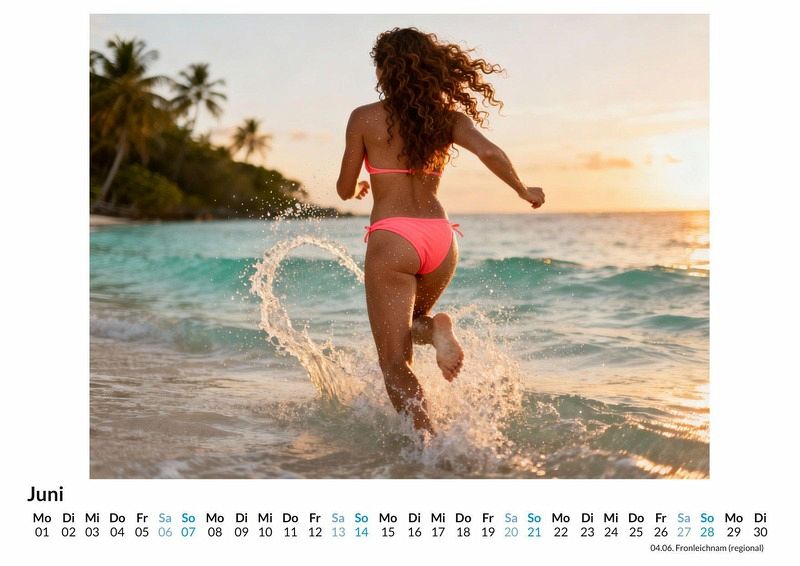 Die Sehnsucht nach endlosen Sommertagen, dem Gefühl von Sand zwischen den Zehen und der Wärme der Sonne auf der Haut findet hier ihre Erfüllung. Dieser Kalender fängt die Essenz unbeschwerter Momente am Meer ein und konserviert sie für das ganze Jahr. Dieser Kalender ist eine gute Wahl: * Für alle, die das ganze Jahr über das Sommergefühl bewahren möchten. * Für Liebhaber von Strandmotiven und sonnengeküsster Ästhetik. * Für Sammler von Kalendern mit einem Fokus auf weibliche Schönheit in sommerlicher Umgebung. Jedes Monatsblatt des Kalenders "Bikini Babes" präsentiert eine Szene, die von der Lebendigkeit des Sommers inspiriert ist. Die dargestellten Modelle und ihre Umgebung wurden mittels digitaler Bildsynthese erschaffen, um eine idealisierte Vision von Strand und Sonne zu verwirklichen. Die Bilder zeigen Frauen in knappen Bikinis an goldenen Stränden, umgeben von kristallklarem Wasser und strahlendem Sonnenschein. Die Kompositionen konzentrieren sich auf die Harmonie von Körper, Licht und Natur. Was der Kalender bietet: * Zwölf unterschiedliche Monatsmotive, die das Thema Sommer und Strand aufgreifen. * Ein Wandkalender im praktischen Format, der sich in jede Umgebung einfügt. * Ein übersichtliches Kalendarium für die Planung von Terminen und das Festhalten von Notizen. Dieser Kalender bringt die unbeschwerte Atmosphäre sonniger Tage in den Alltag. Er ist eine tägliche Erinnerung an die Leichtigkeit des Sommers und die Schönheit goldener Strände. Eine Einladung, sich die Bilder anzusehen und das ganze Jahr über ein Stück Urlaub zu erleben.