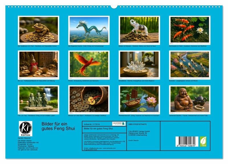 Dieser Kalender zeigt zwölf kraftvolle Symbole des Feng Shui - in stimmungsvollen Bildern, von KI geschaffen, die das Wesentliche sprechen lassen. Monat für Monat entfalten die Darstellungen ihre eigene Energie und erinnern daran, wie wichtig ein harmonischer Fluss des Qi im Wohnraum ist. Bilder, die seit Jahrhunderten für Glück, Liebe, Gesundheit und Wohlstand stehen. Ein stiller Begleiter für alle, die das Qi in ihrem Leben bewusst stärken möchten.