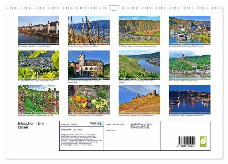 QUALITÄT - Hochwertiger Fotokalender mit 12 wunderschönen Motiven auf lichtbeständigem Bilderdruckpapier, robuste Spiralbindung mit Aufhängebügel.NACHHALTIG - deutliche Abfallreduzierung durch bedarfsgerechte Einzelstückfertigung, umweltfreundliches FSC-zertifiziertes Papier, Produktion in Deutschland, klimabewusste Logistik.PERFEKTES GESCHENK - Kalender für Freunde und Familie, für Kinder und Erwachsene, jung und alt, zu Weihnachten, Geburtstag oder zwischendurch.VIELFALT - Bildkalender in verschiedenen Formaten, z.B. DIN A5, DIN A4, DIN A3 sowie DIN A2. Ob Naturmotiv, Gemälde oder Fotos, ideal für ein persönliches Wohlfühlambiente.Die sonnige Terrassenmosel lädt ein von Autor(in): Maximilian Fuchs