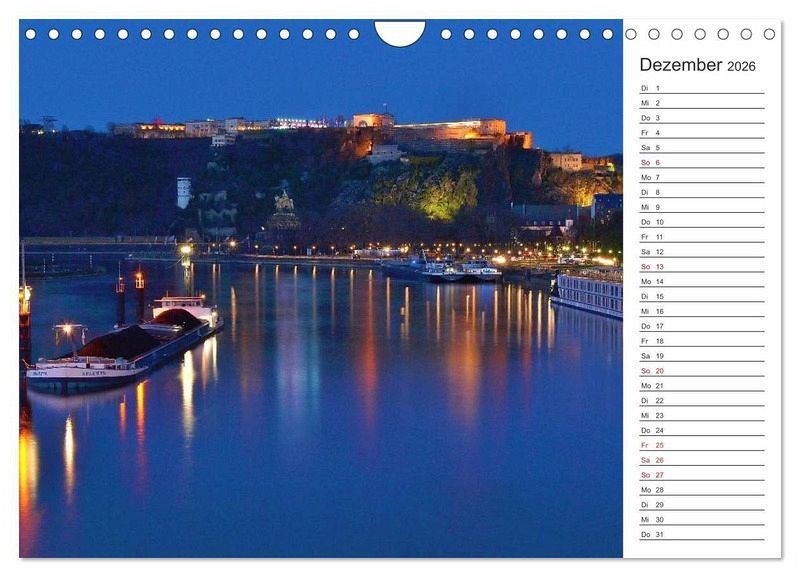 Dezember: Blaue Stunde in Koblenz mit Blick zum Deutschen Eck.
