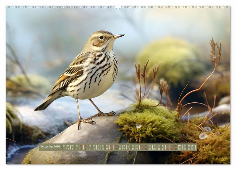 Dezember: Wiesenpieper - Er brütet ebenfalls auf Feuchtwiesen. Leider ist auch sein Bestand durch Klimawandel und Umweltverschmutzung stark gefährdet