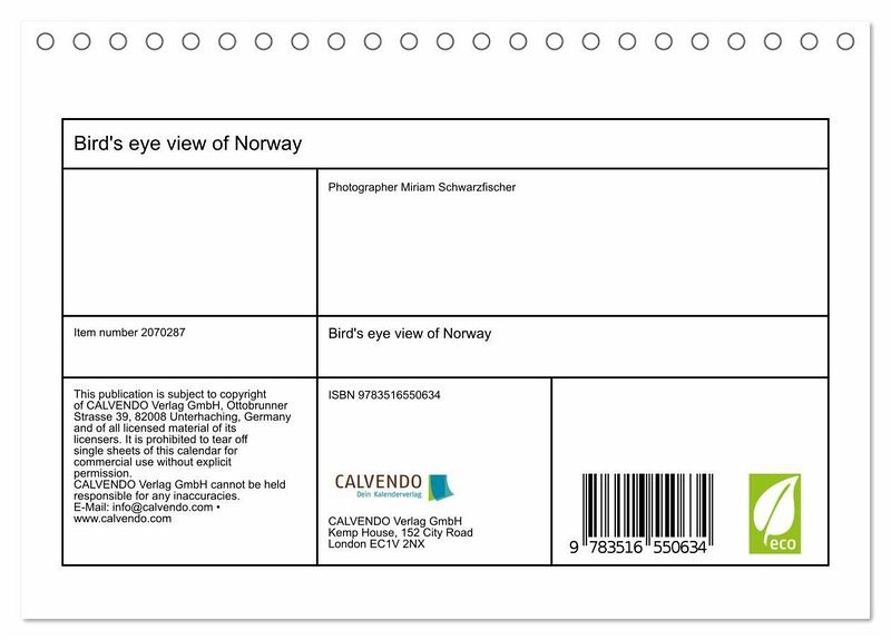 QUALITY - High-quality photo calendar with 12 beautiful images on light-resistant paper, robust spiral binding.SUSTAINABLE - Significant waste reduction due to print-on-demand production, environmentally friendly FSC-certified paper, produced locally, climate-conscious logistical processes.PERFECT GIFT - calendars for friends and family, for children, all ages and all occasions, from Christmas to birthdays and everything in between.LOTS OF CHOICE - Wall calendars in different sizes (DIN A4 and DIN A3), for any topic and personal taste, featuring photography, painting and illustrations.Norway from above von Autor(in): Fotografin Schwarzfischer Miriam