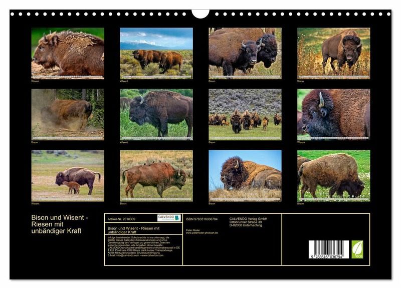Der amerikanische Bison und sein europäischer Verwandter Wisent, riesige, beeindruckende Landtiere, die schon fast ausgestorben waren. Für diesen Kalender hat der Fotokünstler Peter Roder zwölf wunderschöne Aufnahmen dieser urzeitlich aussehenden Kolosse zusammengestellt und gestaltet, eine Freude für jeden Tierliebhaber.