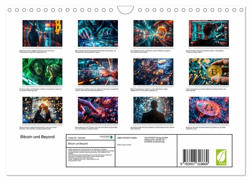 Dieser Kalender ist mehr als nur ein Zeitmesser - er ist eine Reise durch die wichtigsten Ereignisse, technologischen Innovationen und bedeutendsten Meilensteine der Bitcoin-Geschichte. Egal, ob Sie ein langjähriger Krypto-Enthusiast oder ein neugieriger Neuling sind, der Bitcoin und Beyond Kalender ist Ihr perfekter Begleiter durch das Jahr. Lassen Sie sich jeden Monat aufs Neue inspirieren und bleiben Sie stets informiert über die Entwicklungen in der Welt der Kryptowährungen. Alle hier gezeigten Bilder wurden mit Sorgfalt, Liebe und mit Hilfe einer KI generiert. Abschließend werden sie mit Bildbearbeitungsprogrammen überarbeitet und in den Kalender eingefügt.