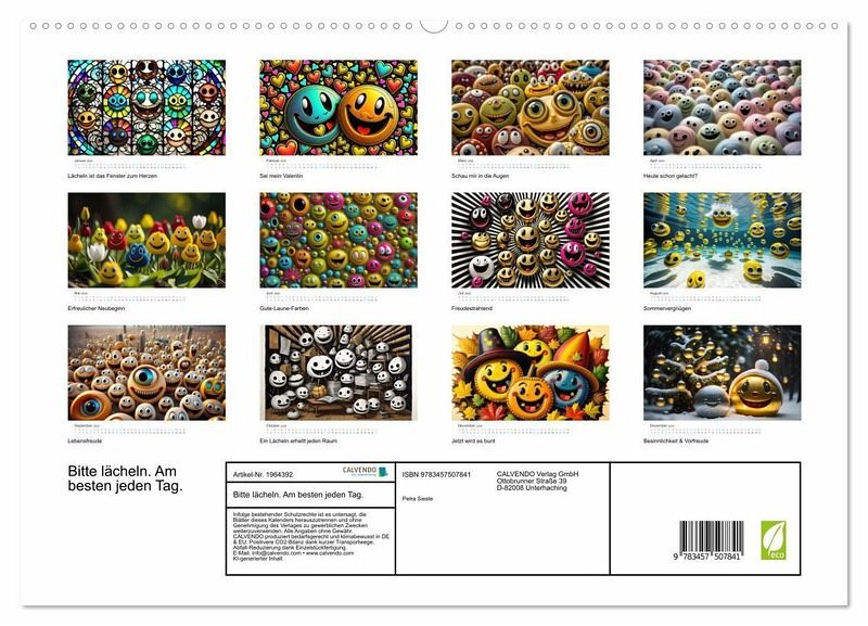 PREMIUM-LINIE - Brillanter Fotokalender mit 12 wunderschönen Motiven, Kunstdruck in Hochglanz in Museumsqualität.QUALITÄT - edle Materialien, stabile Rückwand mit 2 innovativen Einstecktaschen für eine optimale Präsentation an der Wand.NACHHALTIG - deutliche Abfallreduzierung durch bedarfsgerechte Einzelstückfertigung, umweltfreundliches FSC-zertifiziertes Papier, Produktion in Deutschland, klimabewusste Logistik.PERFEKTES GESCHENK - Kalender für Freunde und Familie, für Kinder und Erwachsene, jung und alt, zu Weihnachten, Geburtstag oder zwischendurch.Smilies, mit KI generiert und in PhotoImpact bearbeitet. von Autor(in): Cloudflyer0123