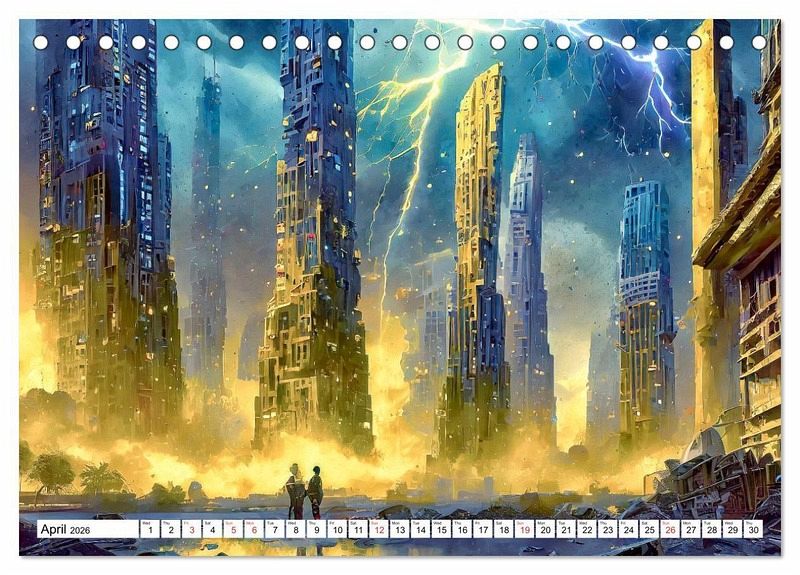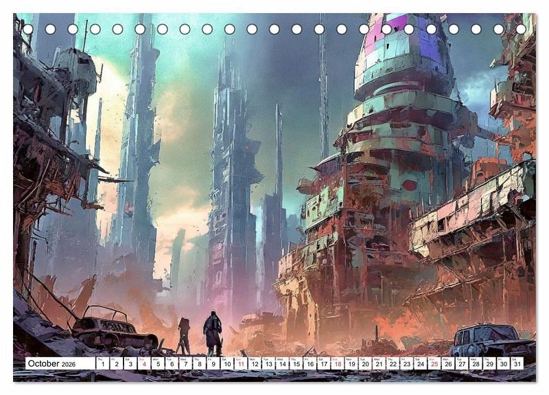 Whatever catastrophes might have taken place: an atomic war, a climate catastrophe with terrible weather events, hunger catastrophes after several global crop failures. In this calendar, we see images of a major city after apocalyptic events. We experience a huge city, which might only exist in the future, as a grotesque ruin in a strange, eerie light. Instead of crowds of people, there are only a few survivors here and there, and robots without function. The images are both a warning of possibly impending events and, on the other hand, they also find a visual appeal in their bizarre strangeness. They were created with the support of artificial intelligence.