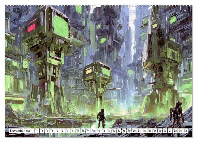 Whatever catastrophes might have taken place: an atomic war, a climate catastrophe with terrible weather events, hunger catastrophes after several global crop failures. In this calendar, we see images of a major city after apocalyptic events. We experience a huge city, which might only exist in the future, as a grotesque ruin in a strange, eerie light. Instead of crowds of people, there are only a few survivors here and there, and robots without function. The images are both a warning of possibly impending events and, on the other hand, they also find a visual appeal in their bizarre strangeness. They were created with the support of artificial intelligence.