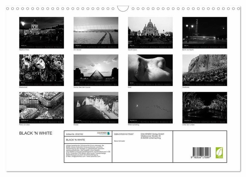 Ob Portraits, Landschaften, Architektur oder Streetphotographie, in Schwarz-Weiß haben sie alle einen ganz besonderen Charme. Vom Louvre in Paris, über wunderschöne Küstenlandschaften, die Siegessäule in Berlin bei Nacht zu einer der berühmtesten Brücken in Paris, der Pont des Arts, sie alle und noch mehr in diesem Kalender.