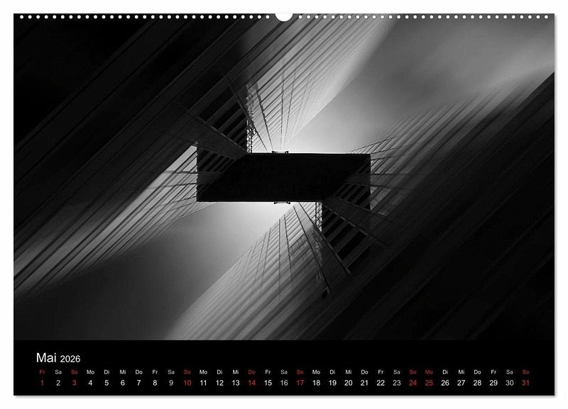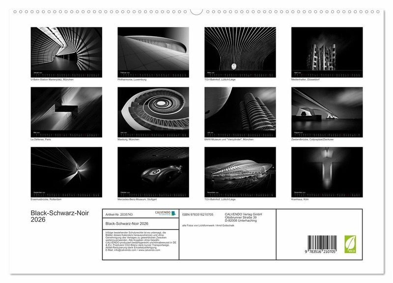 Die mehrfach preisgekrönten Fotos aus der Serie "Black-Schwarz-Noir" sind jetzt erstmals als Kalender erhältlich. Die Bilder zeigen bekannte Bauwerke der modernen Architektur auf neue Weise - strahlend treten sie aus tiefer Schwärze hervor.