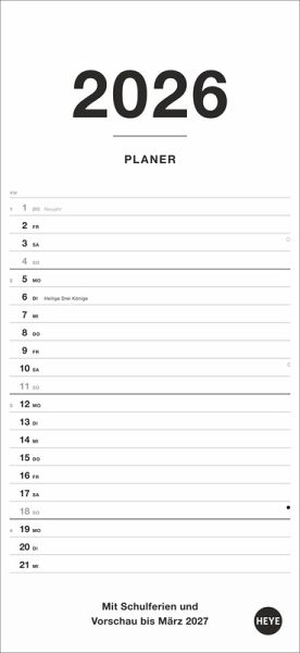 - So klappt's mit den gemeinsamen Verabredungen: Heye-Planer für zwei 2026 mit frei eintragbaren Spalten, Schulferien und Vorschau bis März 2027- Wichtig ist, was ihr draus macht: Monatskalender im Minimalist Design, der jeden Termin ins Rampenlicht rückt- Schlicht, übersichtlich, stilvoll: Schöner Langplaner in schwarz/weiß für den perfekten Überblick über alle Meetings, Geburtstage und Treffen- Black and White trifft auf das bunte Leben: Neutrale Organisationshilfe für Büro und Freizeit im Format 16 x 34,7 cm- Den Überblick über alle wichtigen Termine behalten: Die neutralen Planer von Heye aus dem Athesia-Kalenderverlag
