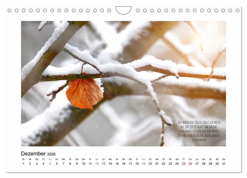 QUALITÄT - Hochwertiger Fotokalender mit 12 wunderschönen Motiven auf lichtbeständigem Bilderdruckpapier, robuste Spiralbindung mit Aufhängebügel.NACHHALTIG - deutliche Abfallreduzierung durch bedarfsgerechte Einzelstückfertigung, umweltfreundliches FSC-zertifiziertes Papier, Produktion in Deutschland, klimabewusste Logistik.PERFEKTES GESCHENK - Kalender für Freunde und Familie, für Kinder und Erwachsene, jung und alt, zu Weihnachten, Geburtstag oder zwischendurch.VIELFALT - Bildkalender in verschiedenen Formaten, z.B. DIN A5, DIN A4, DIN A3 sowie DIN A2. Ob Naturmotiv, Gemälde oder Fotos, ideal für ein persönliches Wohlfühlambiente.Ein Blatt, viele Blätter und immer ein Zitat von Autor(in): Sabine Löwer