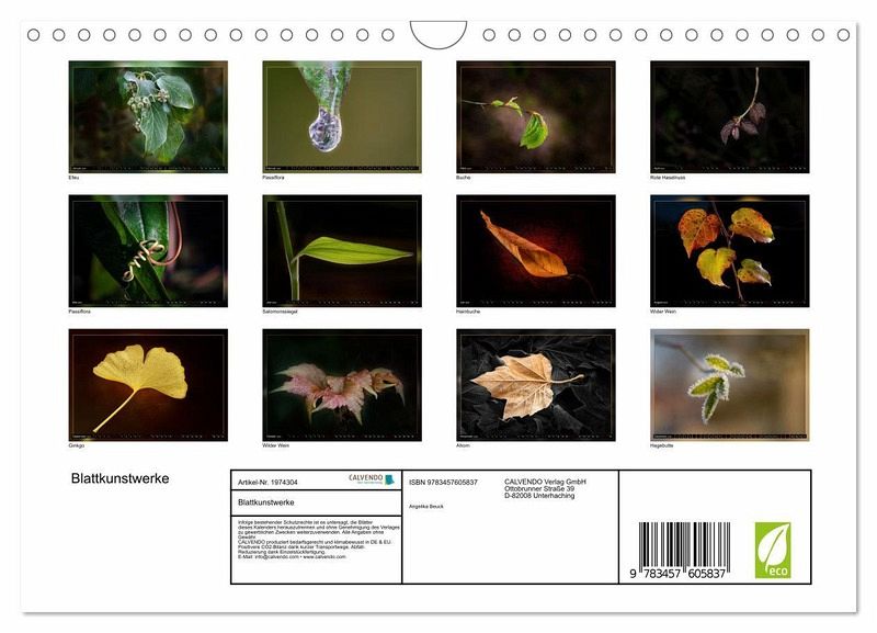 QUALITÄT - Hochwertiger Fotokalender mit 12 wunderschönen Motiven auf lichtbeständigem Bilderdruckpapier, robuste Spiralbindung mit Aufhängebügel.NACHHALTIG - deutliche Abfallreduzierung durch bedarfsgerechte Einzelstückfertigung, umweltfreundliches FSC-zertifiziertes Papier, Produktion in Deutschland, klimabewusste Logistik.PERFEKTES GESCHENK - Kalender für Freunde und Familie, für Kinder und Erwachsene, jung und alt, zu Weihnachten, Geburtstag oder zwischendurch.VIELFALT - Bildkalender in verschiedenen Formaten, z.B. DIN A5, DIN A4, DIN A3 sowie DIN A2. Ob Naturmotiv, Gemälde oder Fotos, ideal für ein persönliches Wohlfühlambiente.Zauberhafte Blätter im Mittelpunkt von Autor(in): Angelika Beuck