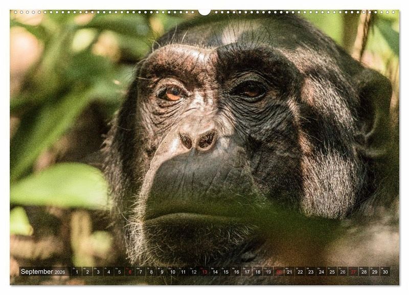 September: blick kontakt mit einem schimpansen im kibale forest national park, uganda.