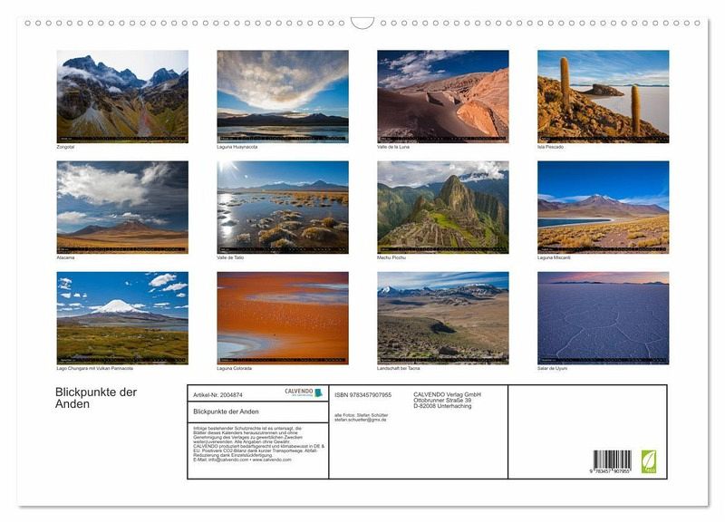 QUALITÄT - Hochwertiger Fotokalender mit 12 wunderschönen Motiven auf lichtbeständigem Bilderdruckpapier, robuste Spiralbindung mit Aufhängebügel.NACHHALTIG - deutliche Abfallreduzierung durch bedarfsgerechte Einzelstückfertigung, umweltfreundliches FSC-zertifiziertes Papier, Produktion in Deutschland, klimabewusste Logistik.PERFEKTES GESCHENK - Kalender für Freunde und Familie, für Kinder und Erwachsene, jung und alt, zu Weihnachten, Geburtstag oder zwischendurch.VIELFALT - Bildkalender in verschiedenen Formaten, z.B. DIN A5, DIN A4, DIN A3 sowie DIN A2. Ob Naturmotiv, Gemälde oder Fotos, ideal für ein persönliches Wohlfühlambiente.Eine Reise durch das Hochland der Anden von Autor(in): Stefan Schütter