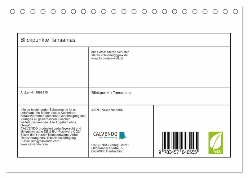 QUALITÄT - Hochwertiger Fotokalender mit 12 wunderschönen Motiven auf lichtbeständigem Bilderdruckpapier, robuste Spiralbindung.NACHHALTIG - deutliche Abfallreduzierung durch bedarfsgerechte Einzelstückfertigung, umweltfreundliches FSC-zertifiziertes Papier, Produktion in Deutschland, klimabewusste Logistik.PERFEKTES GESCHENK - Kalender für Freunde und Familie, für Kinder und Erwachsene, jung und alt, zu Weihnachten, Geburtstag oder zwischendurch.VIELFALT - Bildkalender in verschiedenen Formaten, z.B. DIN A5, DIN A4, DIN A3 sowie DIN A2. Ob Naturmotiv, Gemälde oder Fotos, ideal für ein persönliches Wohlfühlambiente.Eine Bilderreise zu Naturschätzen Tansanias von Autor(in): Stefan Schütter