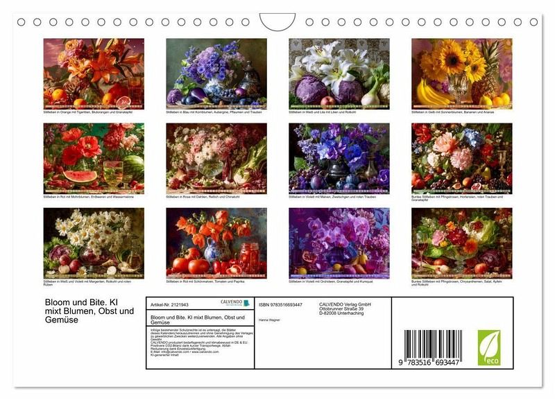 QUALITÄT - Hochwertiger Fotokalender mit 12 wunderschönen Motiven auf lichtbeständigem Bilderdruckpapier, robuste Spiralbindung mit Aufhängebügel.NACHHALTIG - deutliche Abfallreduzierung durch bedarfsgerechte Einzelstückfertigung, umweltfreundliches FSC-zertifiziertes Papier, Produktion in Deutschland, klimabewusste Logistik.PERFEKTES GESCHENK - Kalender für Freunde und Familie, für Kinder und Erwachsene, jung und alt, zu Weihnachten, Geburtstag oder zwischendurch.VIELFALT - Bildkalender in verschiedenen Formaten, z.B. DIN A5, DIN A4, DIN A3 sowie DIN A2. Ob Naturmotiv, Gemälde oder Fotos, ideal für ein persönliches Wohlfühlambiente.Künstliche Intelligenz kreiert opulente Stillleben aus Blumen, Obst und Gemüse - eine farbenfrohe Symbiose aus Natur und digitaler Kreativität. von Autor(in): Hanna Wagner
