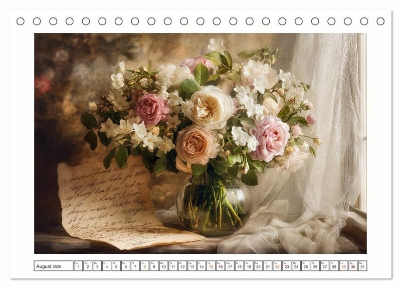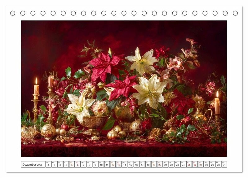 Tauchen Sie ein in eine Zeitreise der Blüten und Farben. Dieser kunstvolle Kalender vereint verschiedene florale Stillleben, jedes inspiriert von einem anderen Stil, einer anderen Stimmung, einer anderen Epoche. Vom dramatischen Kerzenschein des Barock über die feine Schlichtheit der Moderne bis hin zum Leuchten der Zukunft. Jedes Bild erzählt von Schönheit, Vergänglichkeit und Ewigkeit zugleich. Alle hier gezeigten Bilder wurden mit Sorgfalt, Liebe und mit Hilfe einer KI generiert. Abschließend werden sie mit Bildbearbeitungsprogrammen überarbeitet und in den Kalender eingefügt.