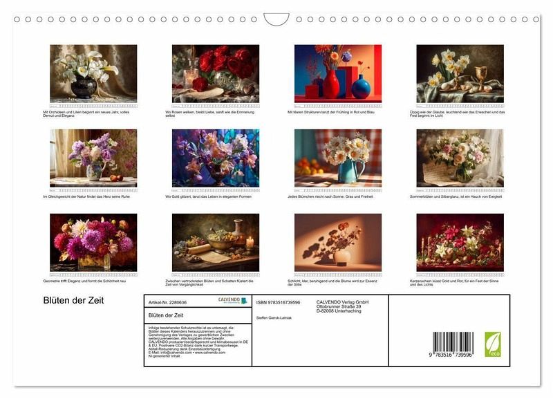 Tauchen Sie ein in eine Zeitreise der Blüten und Farben. Dieser kunstvolle Kalender vereint verschiedene florale Stillleben, jedes inspiriert von einem anderen Stil, einer anderen Stimmung, einer anderen Epoche. Vom dramatischen Kerzenschein des Barock über die feine Schlichtheit der Moderne bis hin zum Leuchten der Zukunft. Jedes Bild erzählt von Schönheit, Vergänglichkeit und Ewigkeit zugleich. Alle hier gezeigten Bilder wurden mit Sorgfalt, Liebe und mit Hilfe einer KI generiert. Abschließend werden sie mit Bildbearbeitungsprogrammen überarbeitet und in den Kalender eingefügt.