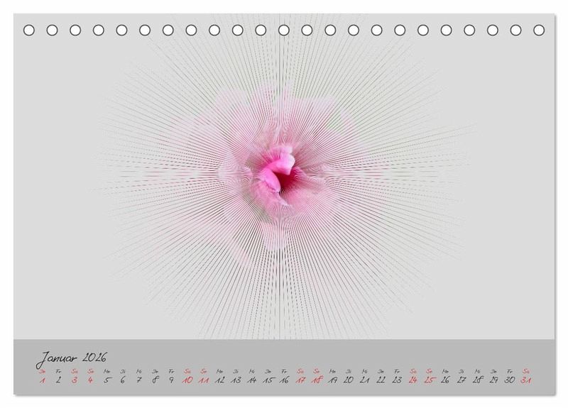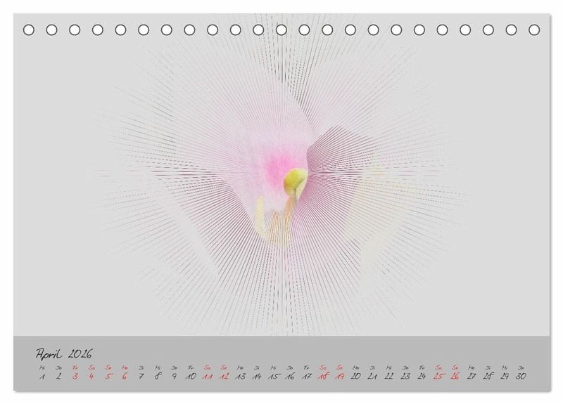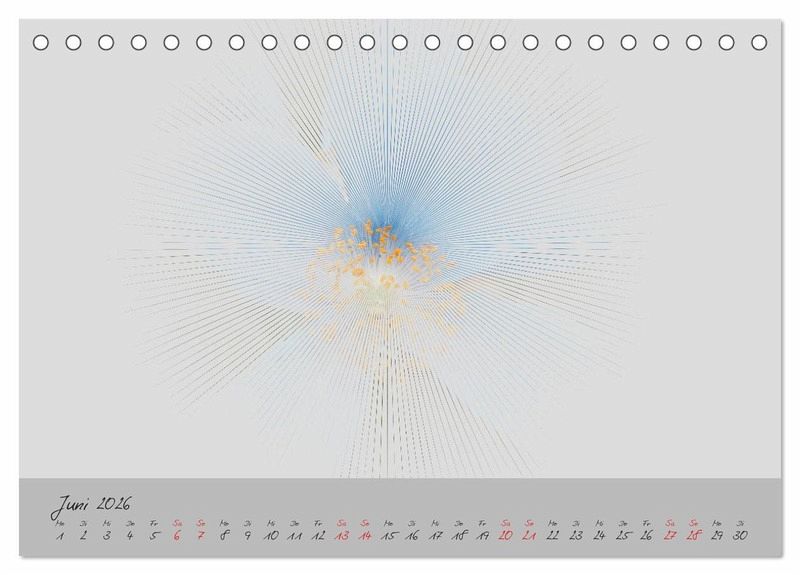 In meinem Kalender "verstecken" sich Blüten hinter angedeuteten Sonnenstrahlen. Diese Sonnenstrahlen setzen das Herz der Blüten frei und vielleicht öffnet sich auch das Herz seines Betrachters. Genießen sie die Momente von Sommer, Sonne und Blütenzauber.